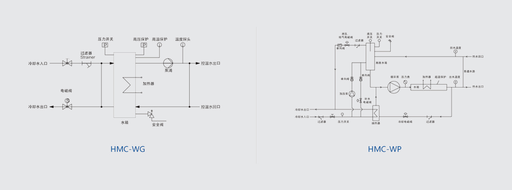 HMC-WP standard with pump overload, phase sequence protection, over temperature protection, overpressure protection, low level protection, water inlet low pressure detection, automatic exhaust water, automatic safety relief, indirect cooling and other security protection to ensure the safe and reliable use.